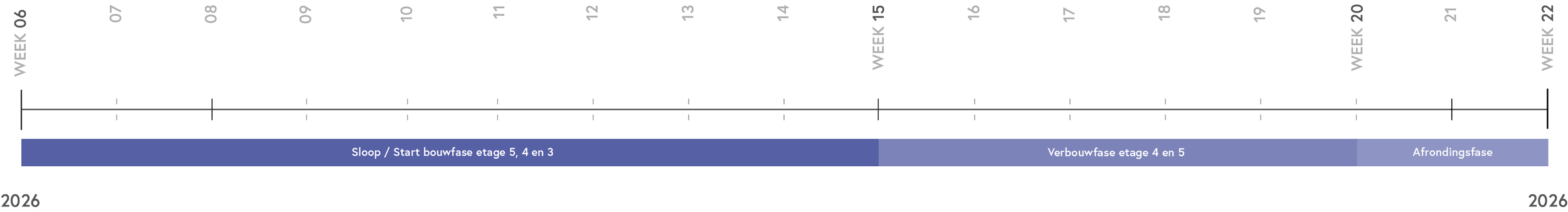 Hier vindt u de planning voor de komende weken. Tijdens deze periode gelden er aangepaste looproutes in verband met de werkzaamheden. Via de button hieronder leest u meer over de alternatieve route.